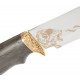 R.A. Knives Light Вовк – це авторський ніж із фіксованим клинком, який впорається з великим спектром завдань. Клинок профілю Bowie має яскраво виражене фальшлезо та слабо увігнуті спуски. Така форма найбільше підходить для використання на природі. Вона дозволяє клинку наносити не тільки досить довгий різ, а й прокол. Сталь клинка 50Х14МФ (X50CrMoV15) – це спеціалізована корозійностійка нержавіюча сталь. Найчастіше її застосовують у створенні медичних інструментів, кухонного приладдя та промислових деталей. Клинок з 50Х14МФ демонструє достатню твердість та ударну в'язкість. Рукоятка виконана з дуба в ергономічній формі, а больстер і навершя є художнім литтям із мельхіору у формі вовчої голови. Ніж укомплектований шкіряними піхвами з петлею для носіння на поясі та ремінцем із заклепкою для фіксації ножа всередині.