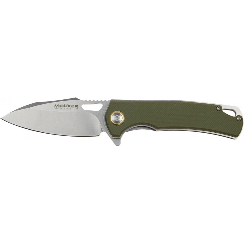 Складной нож Boker Magnum Skeksis создавался под впечатлением от выдуманного существа из фэнтезийного кинематографа 80-х годов. Форма клинка Drop Point, изготовленного из стали марки 440, получила очертание хищного клюва. Плавное извлечение клинка обеспечивает система шарикоподшипников. Подпальцевая выемка для открытия ножа имеет форму глаз, а цвет фактурных накладок на рукояти из G10 передает цвет кожи существа. Для большего удобства во время грубой работы, на обухе размещен ряд насечек для упора большим пальцем. Также, как альтернатива подпальцевому отверстию, нож можно открыть с помощью флиппера. Фиксация в открытом положении происходит с помощью крепкого замка Liner Lock. На торце размещено отверстие для темляка, а также карманная клипса в положении tip-up.