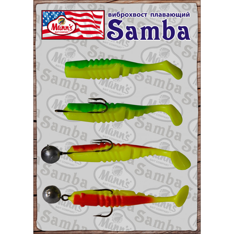Віброхвіст Samba завдяки спеціальному складу силікону має плаваючі властивості. Плаваюча силіконова приманка значно розширює можливості лову, дозволяючи рибалити у вікнах між рослинністю, у закоряжених місцях і на мілководді. Завдяки використанню шарнірного кріплення двійник + вантаж "чебурашка", віброхвости Samba здатні найбільш точно імітувати рибу, що годується, зависаючи вертикально біля дна. Плаваюча віброхвіст Samba має нестандартні насічки на хвості, зигзагоподібні, що дає відмінну рухливість хвоста при більшій його міцності. На тілі Samba є спеціальні канавки для надійного кріплення у розщепі подвійного гачка. Одягнути та зняти приманку ви зможете, не пошкодивши силікон.