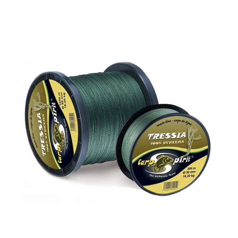 Шнур CARP SPIRIT Tressia 300m - шнур, який складається на 100% з волокон Dyneema і має спеціальне покриття, яке надає краще ковзання а також створює додатковий захист від пошкоджень. Має практично нульову розтяжність, високу абразивну стійкість і добре тримає вузол. Спеціально створений для лову в "складних" місцях водойм (зі складним дном, з безліччю можливих перешкод). Орієнтований для карпової рибалки, тому має зелений колір, який ідеально підходить для таких водойм. Поставляється в розмотці 300м.