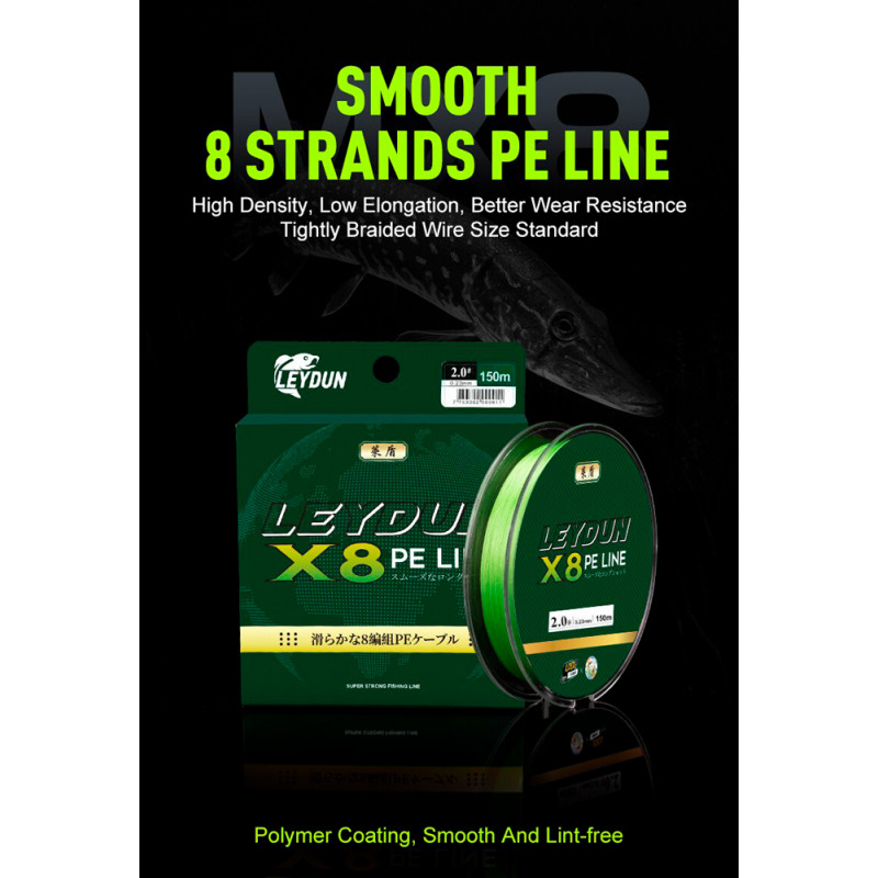 Шнур Leydun PE 8X,150 м. Полиетиленовий 8 жильний шнур виробництва Китай. М’який малошумний шнур високої якості. За багатьма показниками не поступається відомим брендам. Враховуючи низьку вартість, може стати гідною заміною дорогим шнурам.