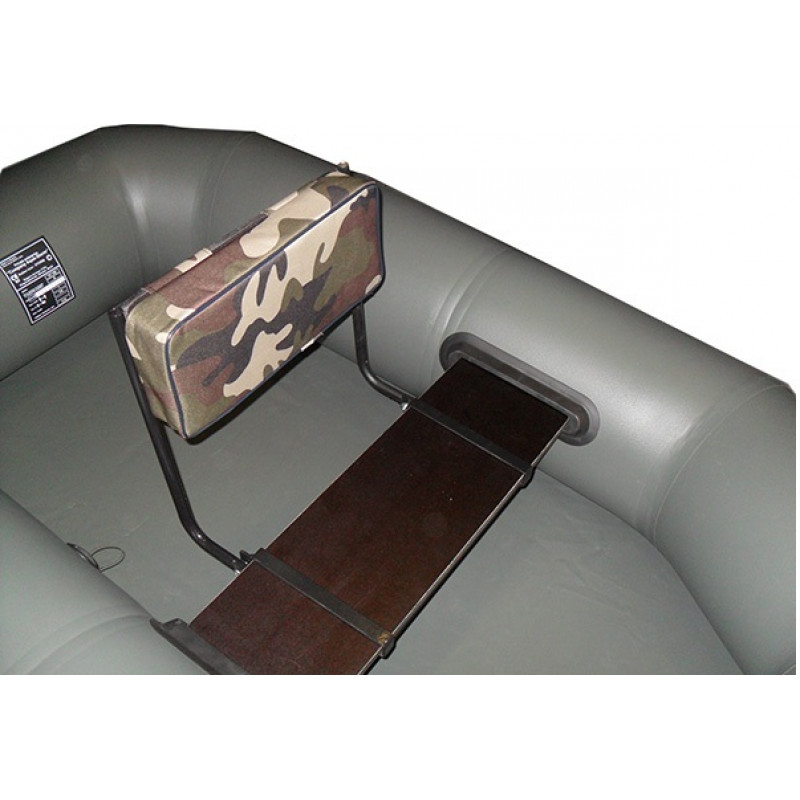 Спинка виготовлена з металевого каркаса, міцної вологостійкої фанери. Іде в комплекті з м'якою спинкою, виготовленою з камуфльованого матеріалу "Оксфорд", який має підвищену міцність і стійкість до зношування. Складне поворотне сидіння дуже легко і швидко встановлюється на штатні сидіння будь-якої надувної човна шириною 20 см.